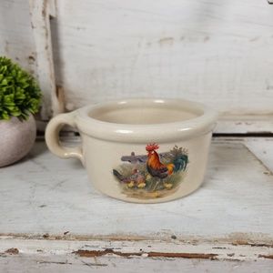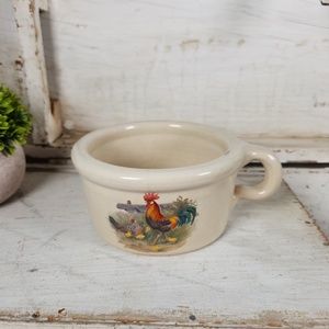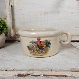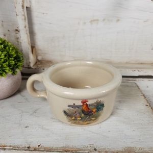 Vintage Shaker & Thangs Marshalls Pottery Large Soup Bowl Crock Pottery with image of a Rooster and Hen. The image is on both sides of the crock pottery. Approx measures 2.75" high x 5.25" in diameter (6.5" w/ handle). It has a small hairline crack on one side (which can be seen above the rooster's head). It also has a spot on the lip. Please review all photos as it helps represent the item. Free of chips.