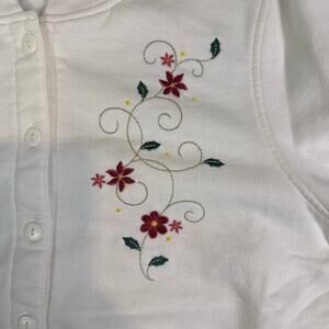 White VTG Shenanigans embroidered floral cottagecore button up sweatshirt, womens size L. Its in great condition, has a couple tiny light stains on the front