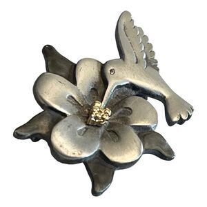 Vintage Shields PEWTER HUMMINGBIRD BROOCH PIN Flower Silver Gold 2" Signed Jewelry - NEW Condition!