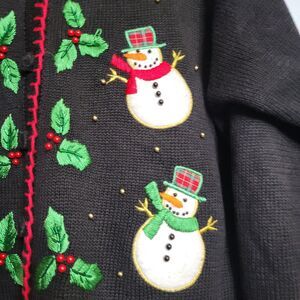 This is a charming vintage Ship 'N Shore Sport Christmas cardigan, perfect for the holiday season. The sweater is black with vibrant red trim along the placket, hem, and cuffs. It features four appliqued snowmen wearing festive hats and scarves, along with embroidered holly and berries throughout the front. The snowmen and holly leaves are embellished with small beads, adding a touch of sparkle. The sweater has a crew neck and buttons up the front with four black buttons.