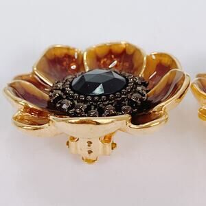 Amber petals ripple with depth and light, each flower centered by a glossy jet-black stone that subtly catches attention. Their bold enamel and gold tone setting capture the refined glamour of late-20th-century costume design.