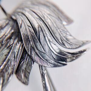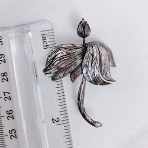 Features: Unique detailed feather-like petals, bud detail, pin-back clasp, hand-crafted texturing, curved stem design, 7.8 grams of sterling silver
