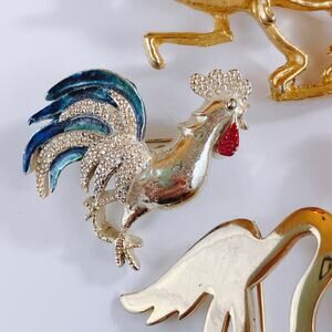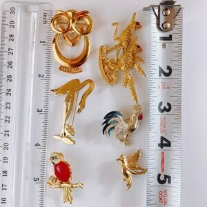 Features: Mixed bird motif (rooster, owl, flamingo, hummingbird, red-breasted songbird, pair of roadrunners); textured gold-tone metal; enamel accents; molded red cabochon; pavé rhinestones; secure functioning pin backs