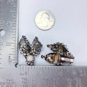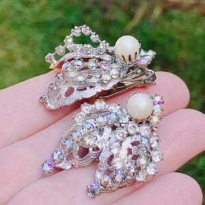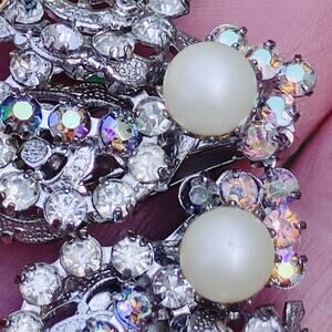 Features: Signed Hobé on clips; ornate layered filigree construction; cluster design; prong-set rhinestones; aurora borealis sparkle; faux pearl center accents; clip-on backs with comfort pads