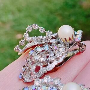 Materials: Silver tone metal; aurora borealis rhinestones; faux pearls