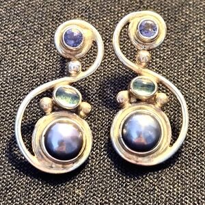 These vintage swirl design earrings feature a stunning combination of 925 Sterling Silver and black pearls with blue & green cabochon gemstones (?). EVC 1" Makers Mark SAJEN 925