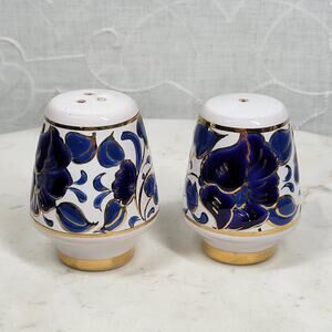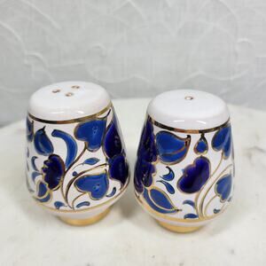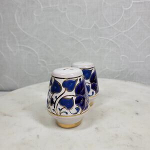 These shakers feature a white base adorned with vibrant blue floral patterns and elegant gold trim, adding a touch of sophistication to any table setting. Marked on the bottom, these shakers combine functionality with decorative appeal, making them a delightful addition for collectors and those who appreciate vintage kitchenware.
