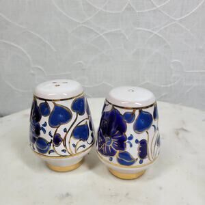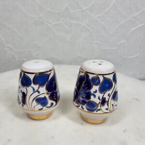 VTG Signed Salt & Pepper Shakers 3" Blue Floral Porcelain Gold Trim Hand Painted