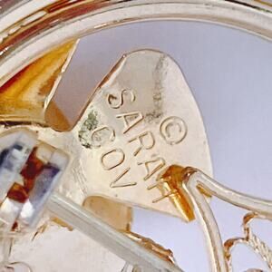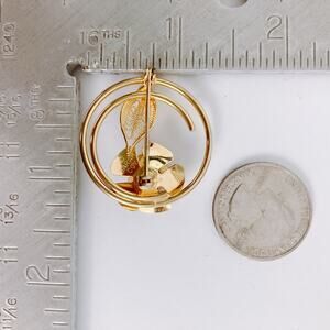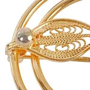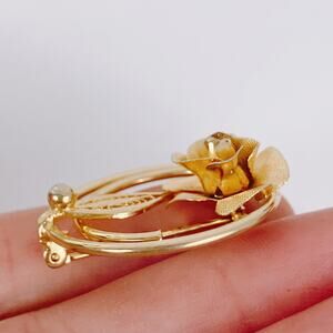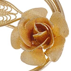 A finely textured mesh rose rests within golden arcs, balanced by a filigree leaf that reflect the retro artistry of Sarah Coventry’s mid-century designs.