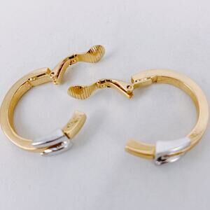 Features: Clip-on hoops; two-tone metal finish with raised silver-tone accent; signed with crown Trifari © mark on both clip backs