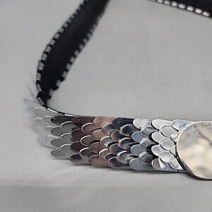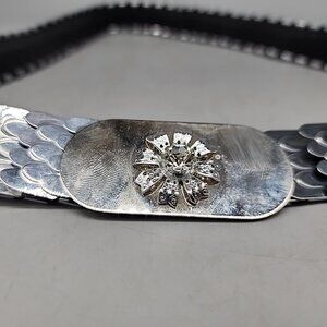 The VTG Silver Metal Serpentine Fish Scale Stretch Fashion Belt is a retro piece perfect for adding a touch of glam to any outfit. This medium-width belt features a geometric pattern of silver metal scales, with a stretchy spandex material for comfortable wear. The layered design and buckle accent add a trendy touch to this vintage-inspired accessory. Ideal for those who love the 80s, 90s, and disco styles, this belt is one size fits all and versatile for any fashion-forward woman looking to make a statement with their accessories.