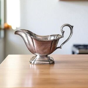 Add timeless elegance to your dining table with this beautiful vintage silver-plated gravy boat. Featuring a gracefully curved spout, paneled body, and detailed scroll handle, this piece reflects early to mid-20th-century craftsmanship. It rests securely on a scalloped pedestal base, perfect for serving gravies, sauces, or au jus at formal dinners or festive gatherings.