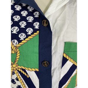 Add a touch of coastal charm to your wardrobe with this vintage Silver Threads button-up shirt. The shirt features a multicolor stripe pattern with seashell and rope prints, perfect for a beachy or ocean-themed outfit. The collared neckline and button closure offer a classic and casual style, while the long sleeves with casual sleeves offer versatility for different occasions.