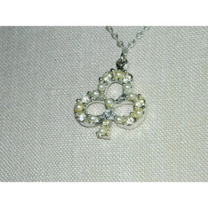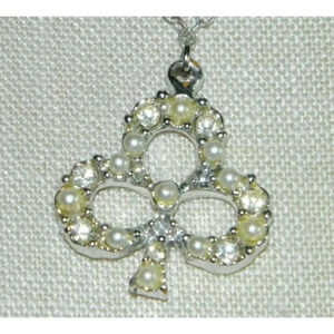VTG Silver Tone Clear Rhinestone Faux Pearl Irish Clover Pendant Necklace