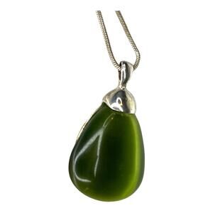 VTG Silver Tone & Green Glass Tiger Eye Teardrop Pendant NECKLACE 16-19" Adjusts