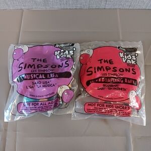 Up for sale is a rather rare lot of 2 Subway Kids Pak toys. This lot contains both Skateboarding Bart and Musical Lisa figures from the Simpsons. Bart is a wind up toy and Lisa seems to be a toy whistle or something of that type. These were released in 1997 and are still new and sealed in the packages. Thanks for looking!