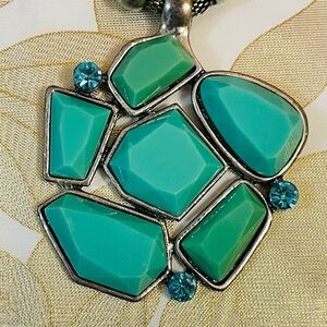 This stunning necklace set features a turquoise pendant and a green geometric design, perfect for adding a pop of color to any outfit. Ideal for any occasion.