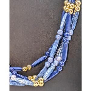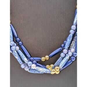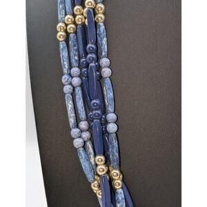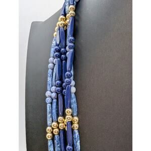 VTG Six Strand Layered Multi Shades of Blue Elliptical Gold Bead 30" Necklace