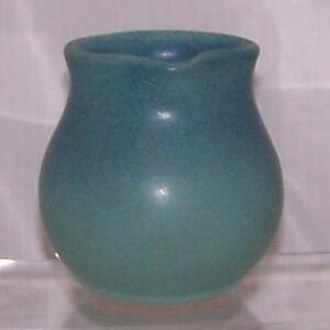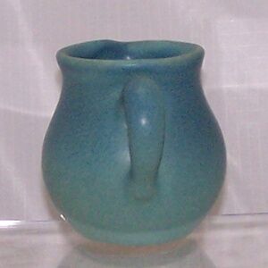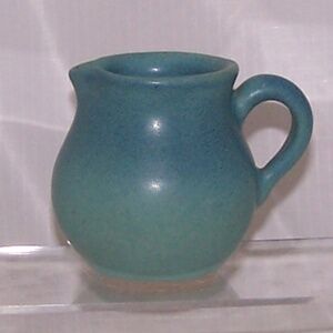 This is a small, rounded pitcher with a handle, likely used for cream or other liquids. It has a two-tone turquoise blue color and a glossy finish, which may indicate it's made of glazed pottery. Pitchers are typically used for holding and pouring liquids. Small pitchers, like this one, are often used as creamers for coffee or tea. They can also be used for serving sauces, dressings, or syrups.