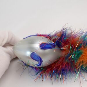 This rare Soffieria De Carlini peacock ornament with shimmering silver glitter and vibrant, colorful feathers. Its multi-colored, luxurious tail feathers add a striking and festive charm.
