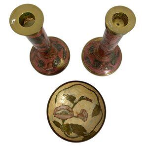 Minor tarnishing and wear on brass, some paint fading/flaking on enamel. Candle holders height: 8.5", candle base diameter: 4.15"; Pedestal bowl height: 2.75", Bowl diameter top: 4.85".