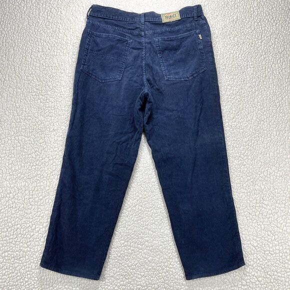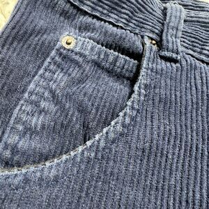 Soft, mid-wale corduroy with a sturdy cotton feel and a classic straight-leg cut. These late-80s to early-90s Solo Semore pants were made in the USA from 100% cotton and feature a deep navy tone with light texture variation from wear. Timeless and versatile perfect for vintage, grunge, or Americana-style outfits.