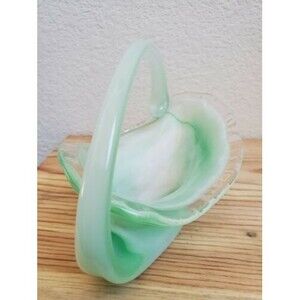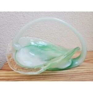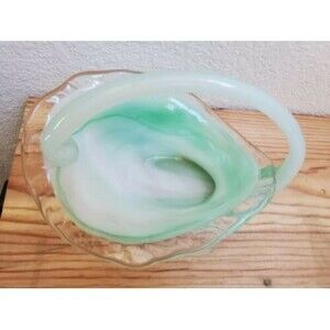 VTG Sooner Student Art Glass Bowl Basket Centerpiece Hand Blown White Green 9"