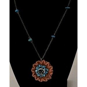 This VTG South Western Style Turquoise & Leather Sterling Silver Chain Necklace features a round pendant with a mix of turquoise stones in a turquoise blue color. The necklace has a hook closure and a length of 16-18.5 inches, making it adjustable for all occasions. The vintage piece is crafted with sterling silver and a pavé setting, adding a touch of elegance to the unisex design. The necklace is a unique and original piece from the brand GUESS, making it a standout accessory for anyone looking to add a pop of blue to their wardrobe.