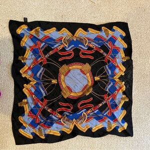 Black silk scarf with nautical/equestrian design. Small area of discoloration.