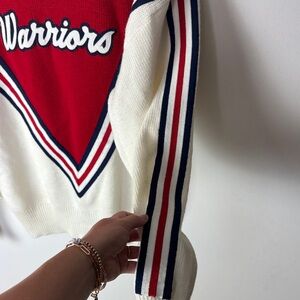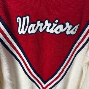 Gently Used Vintage Spirit by Logan Warriors Cheerleader Sweater. This is a missing a size tag, but I think it is a large. Check out the measurements to ensure this will work out for you! White with blue and red. Warriors text in cursive on the front. In excellent condition given its age! 100% acrylic. Made in USA.