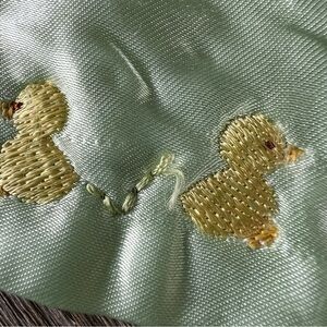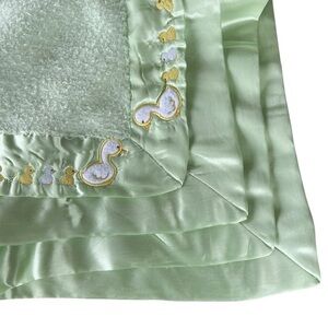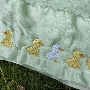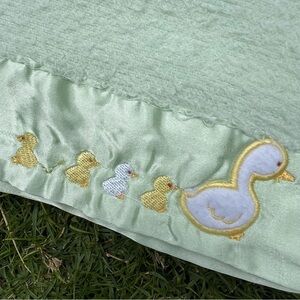 Vintage Springmaid Baby Ducks-In-A-Row Satin Lined Baby Blanket. Light Green color with embroidered Mama Duck and babies on two corners. Soft, bamboo blend is super cuddly and snuggly.