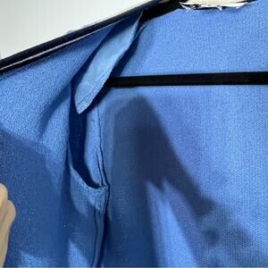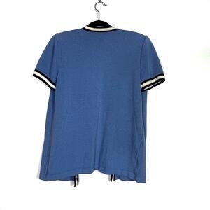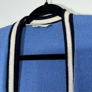 Cornflower blue sweater with navy and white striped trim embellished with small gold rivets. Santana knit. Open front. Pockets. Shoulder pads. Made in USA