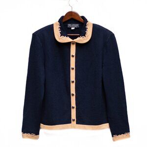 🧵 VTG St. John Santana Knit Cardigan Blazer Women’s 14 Navy Blue Beige Trim Gold Buttons