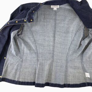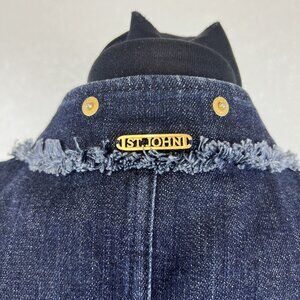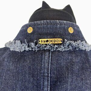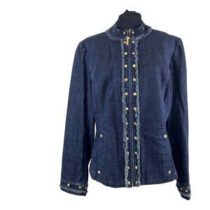 VTG St John Sport Classic Chic Preppy Denim Jacket Frayed Trim & Gold Details L