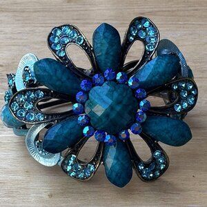 VTG Statement Flower Bracelet Teal Blue Rhinestones Glass Crystal Clamper Chunky