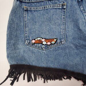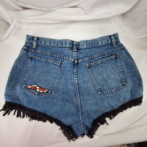 These repurposed denim shorts feature a unique fringe trim and a patch for added style. Crafted from durable cotton, ideal for casual wear.