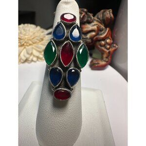 A bold statement ring featuring vibrant red, green, and blue teardrop gemstones set in durable silver. Its vintage charm and adjustable size combine style and functionality, making it an eye-catching addition to any jewelry collection. The intricate design highlights craftsmanship, ensuring lasting elegance and uniqueness.