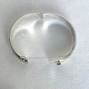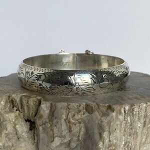 Vintage Sterling Silver 925 14mm Wide Etched Scrollwork Hinged Hollow Round Bangle Bracelet Hidden Box Clasp Closure Safety Clasp Chain