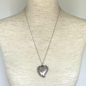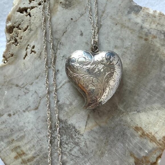 VTG Sterling Silver 925 1.5" Etched Filigree Puffy Heart Pendant Necklace 24”