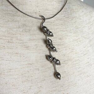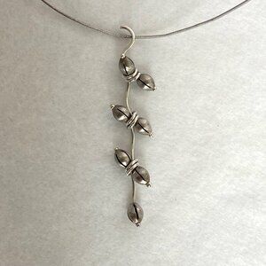 Vintage Sterling Silver 925 Hand-wrought Modernist Beaded Acorn Floral Wire Y Necklace
