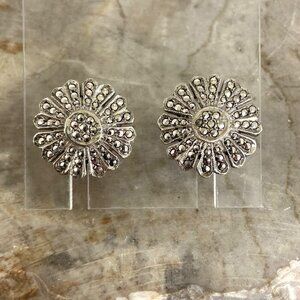 Vintage Sterling Silver 925 Marcasite Floral Flower Screwback Stud Earrings