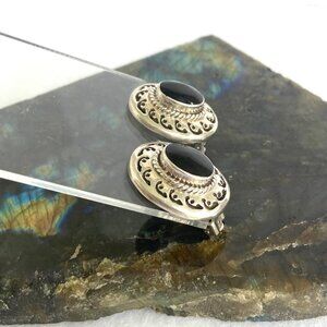 Vintage Sterling Silver 925 Mexico Heavy Oval Bezel Set Black Onyx Clip On Earrings With Pierced Metal Detail