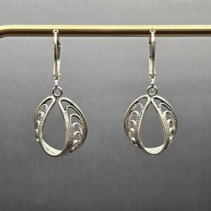 Elegant sterling silver earrings with a rounded teardrop silhouette and intricate filigree openwork. Crafted in 925 silver, these lightweight earrings feature secure leverback closures. Measuring approx. 1.25" in drop length, they balance delicate lace-like texture with timeless design. Total weight: 3.34g. Marked 925, unsigned.
