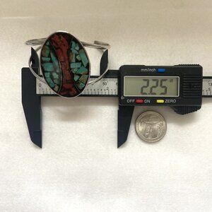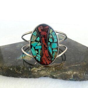 Vintage Sterling Silver 925 Large Southwest Style Oval Inlaid Crushed Turquoise & Coral Cuff Bracelet Split Shank Band