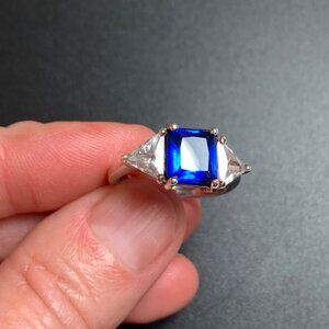 Sterling Silver Synthetic Sapphire & Cubic Zirconia Engagement Style, Emerald Cut Centerstone approximately 2 carats