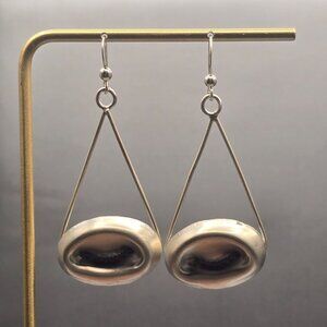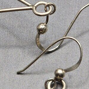 Vintage sterling silver dangle earrings with a bold modernist triangular frame. Marked 925 on the hook closure. Approx. 2.25" long and 9.16g total weight. Sculptural and lightweight with elegant movement. A striking pair for lovers of minimalist design, artisan silver, or geometric jewelry.