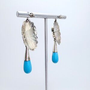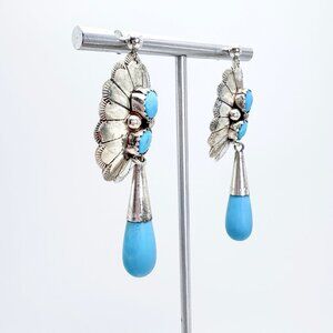VTG Sterling Silver 925 Turquoise Flower Design Dangle Earrings 2.25" Length