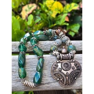 Vintage Sterling Silver Aventurine Green Quartz Tribal Pendant Statement Necklace
