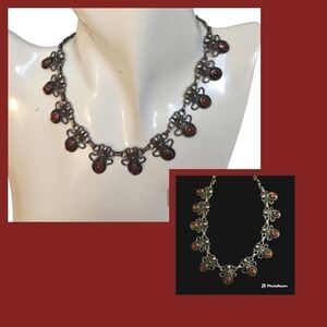 Add a touch of fantasy to your jewelry collection with this vintage teardrop bib necklace. The pendants feature a striking red carnelian gemstone on a 16-inch sterling silver chain. The necklace is perfect for those who love Gothic style and fairytale-inspired fashion.