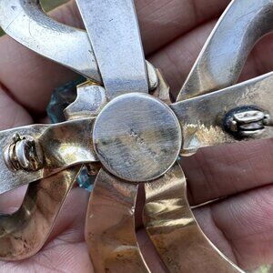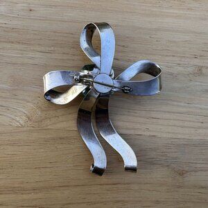 Measuring 4 inches in length total weight of 29.4 grams, this brooch makes a bold statement when wearing. The curled ribbon bow adds a touch of retro charm, making it a great piece for any vintage jewelry lover. This brooch is a timeless piece that will never go out of style. In good pre owned condition with some minor use or handling wear on the sterling silver with minor oxidation, stone is original, and clasp functions properly.